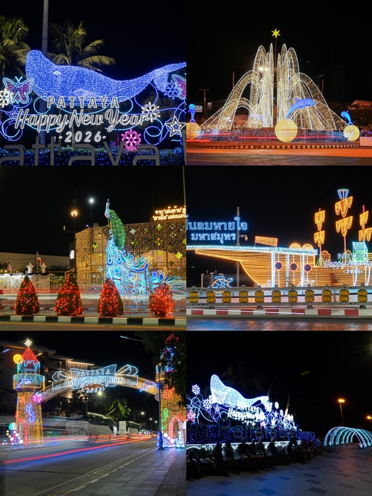 5. หาดจอมเทียน : จุดประดับไฟตกแต่งเป็นรูปปลาวาฬขนาดใหญ่ พร้อมซุ้มอุโมงค์ประดับไฟยาวกว่า 12 เมตร นำเสนอเรื่องราวพระราชกรณียกิจของสมเด็จพระพันปีหลวงในหลากหลายด้าน