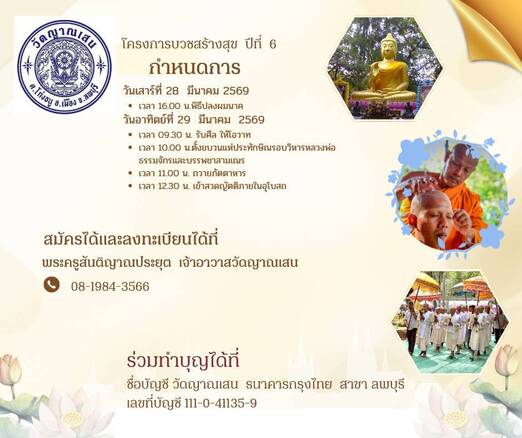ขอเชิญพุทธศาสนิกชนผู้มีจิตศรัทธา เข้าร่วม โครงการบวชสร้างสุข ปีที่ 6