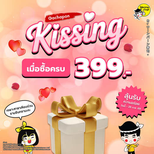 พร้อมเพิ่มสีสันความสนุกกับกิจกรรม “Gachapon Kissing” เพียงมียอดใช้จ่ายครบ 399 บาท รับสิทธิ์ลุ้นรับรางวัล 1 สิทธิ์ (สำหรับสาขาที่ร่วมรายการเท่านั้น) ให้มื้อพิเศษของคุณเต็มไปด้วยความตื่นเต้นและเซอร์ไพรส์